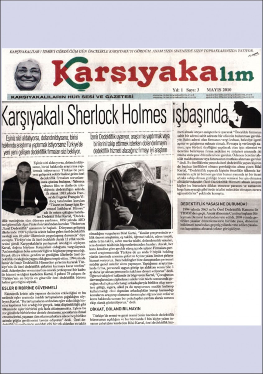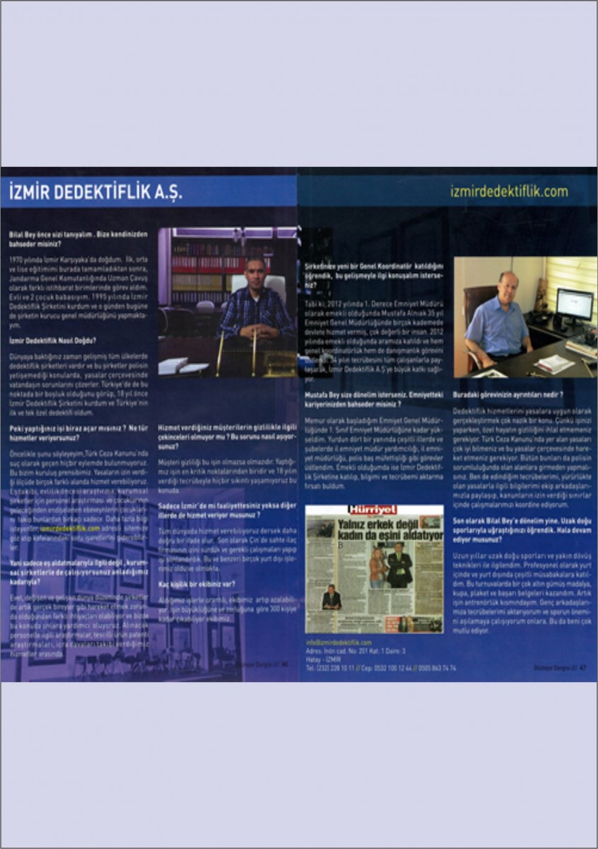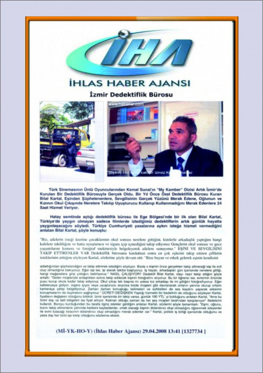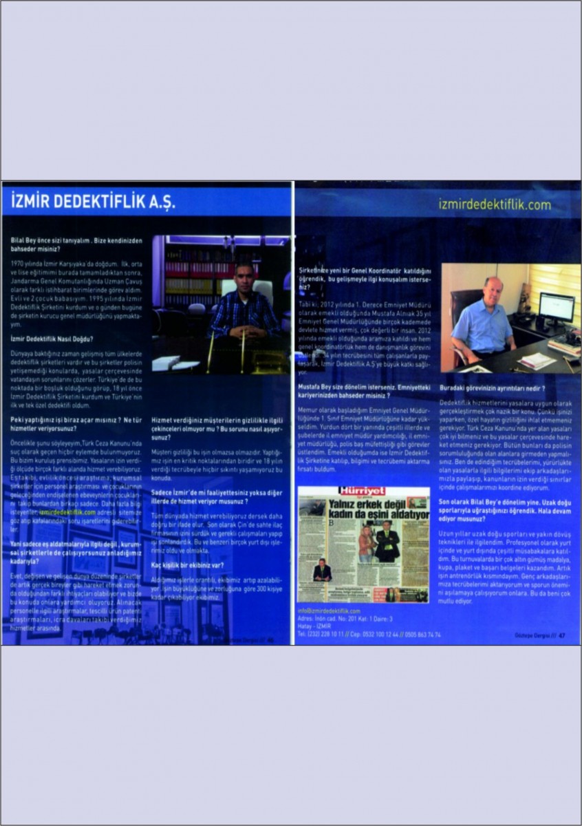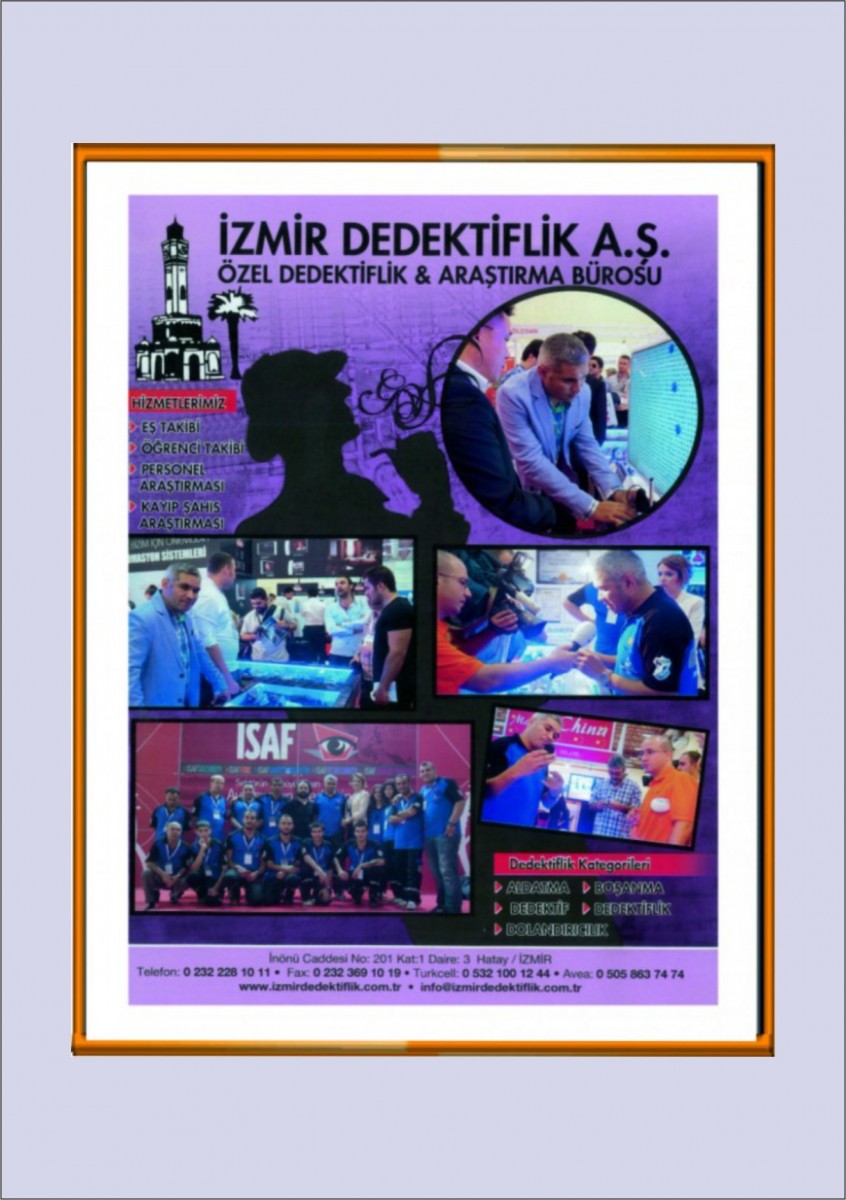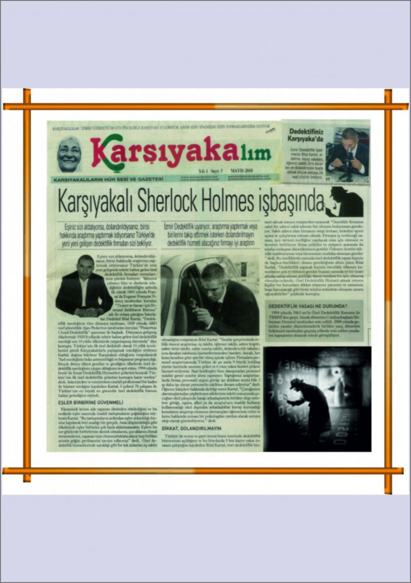 İzmir'de kurulan ilk özel dedektiflik bürosu, fuar etkinlikleriyle de basın aracılığıyla tüm çalışmalarını saygıdeğer vatandaşlarımızla paylaşıyor. Bu bakımdan siz de tüm çalışmalarımızı görmek istiyorsanız resmi web sitemizin Basında Biz alanından basında hakkımızda çıkan haber başlıkları, fuar etkinliklerimiz, genel müdürümüzün mesajı ve resmi belgelerimizi tümüyle görebilirsiniz.