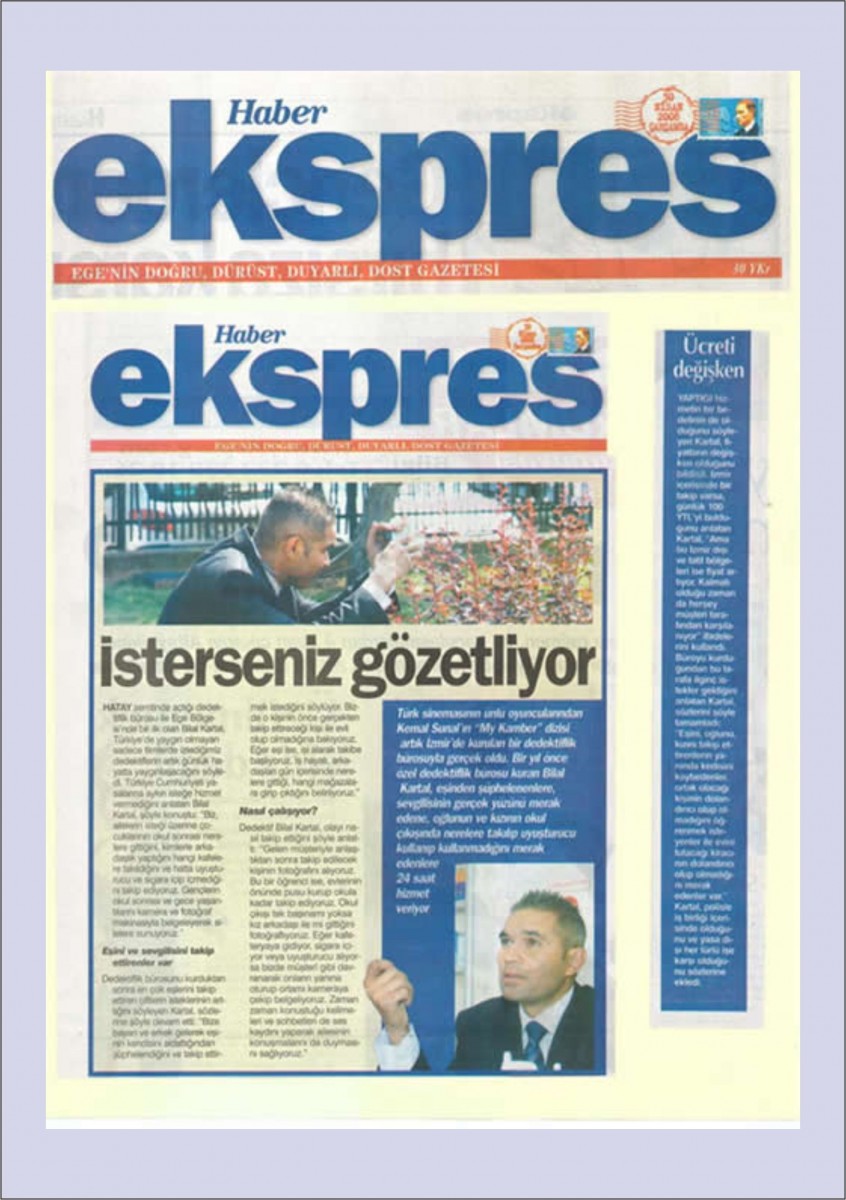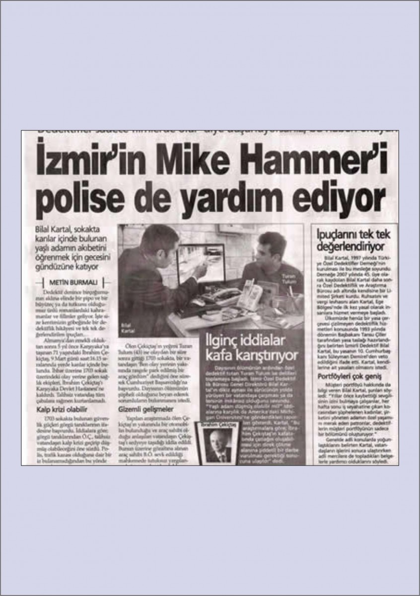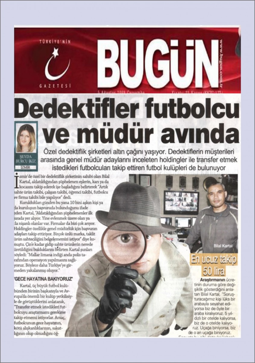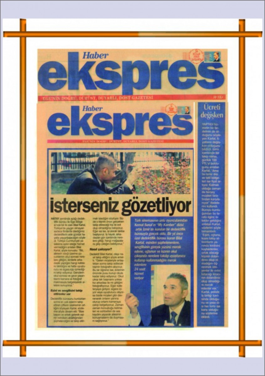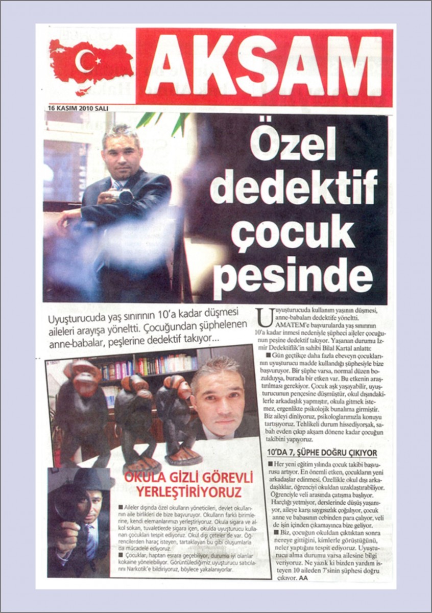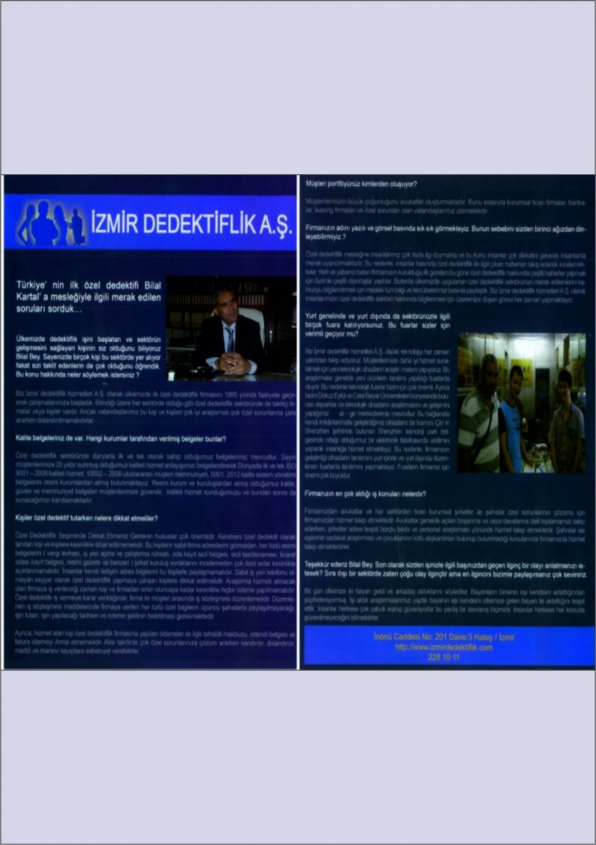 İzmir'de kurulan ilk özel dedektiflik bürosu, fuar etkinlikleriyle de basın aracılığıyla tüm çalışmalarını saygıdeğer vatandaşlarımızla paylaşıyor. Bu bakımdan siz de tüm çalışmalarımızı görmek istiyorsanız resmi web sitemizin Basında Biz alanından basında hakkımızda çıkan haber başlıkları, fuar etkinliklerimiz, genel müdürümüzün mesajı ve resmi belgelerimizi tümüyle görebilirsiniz.