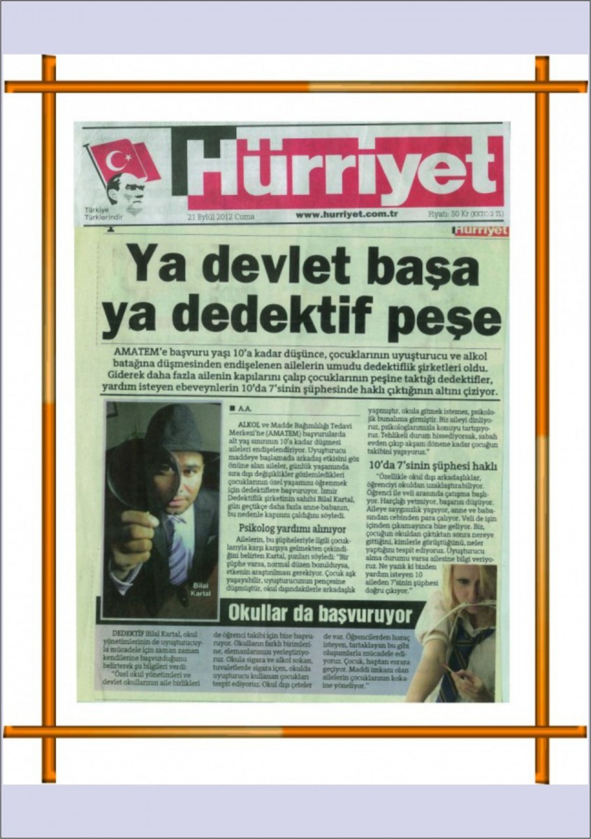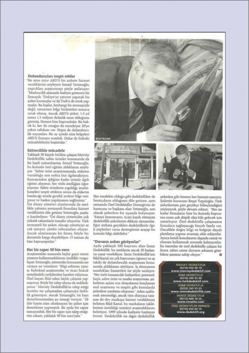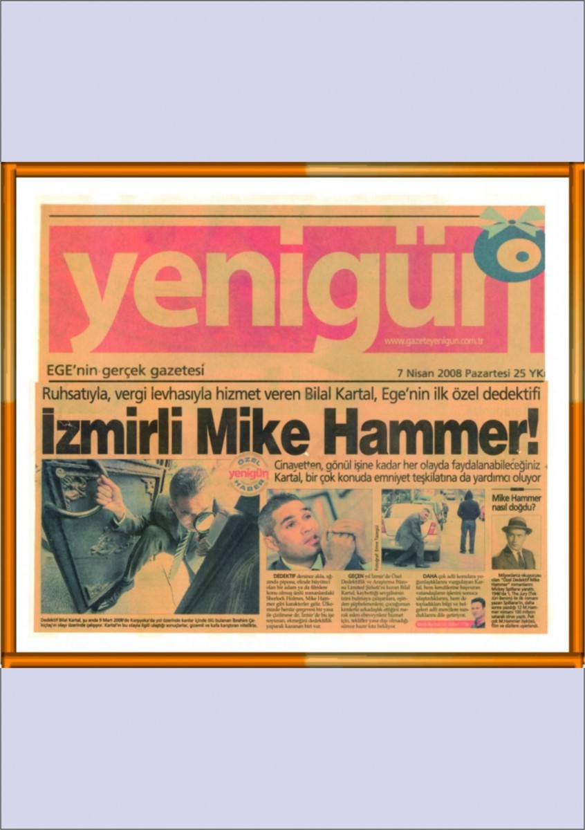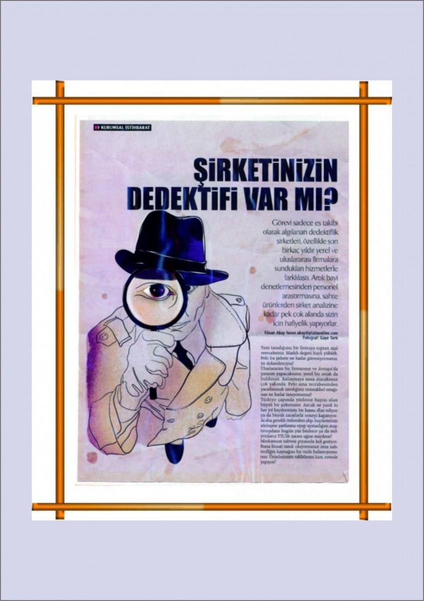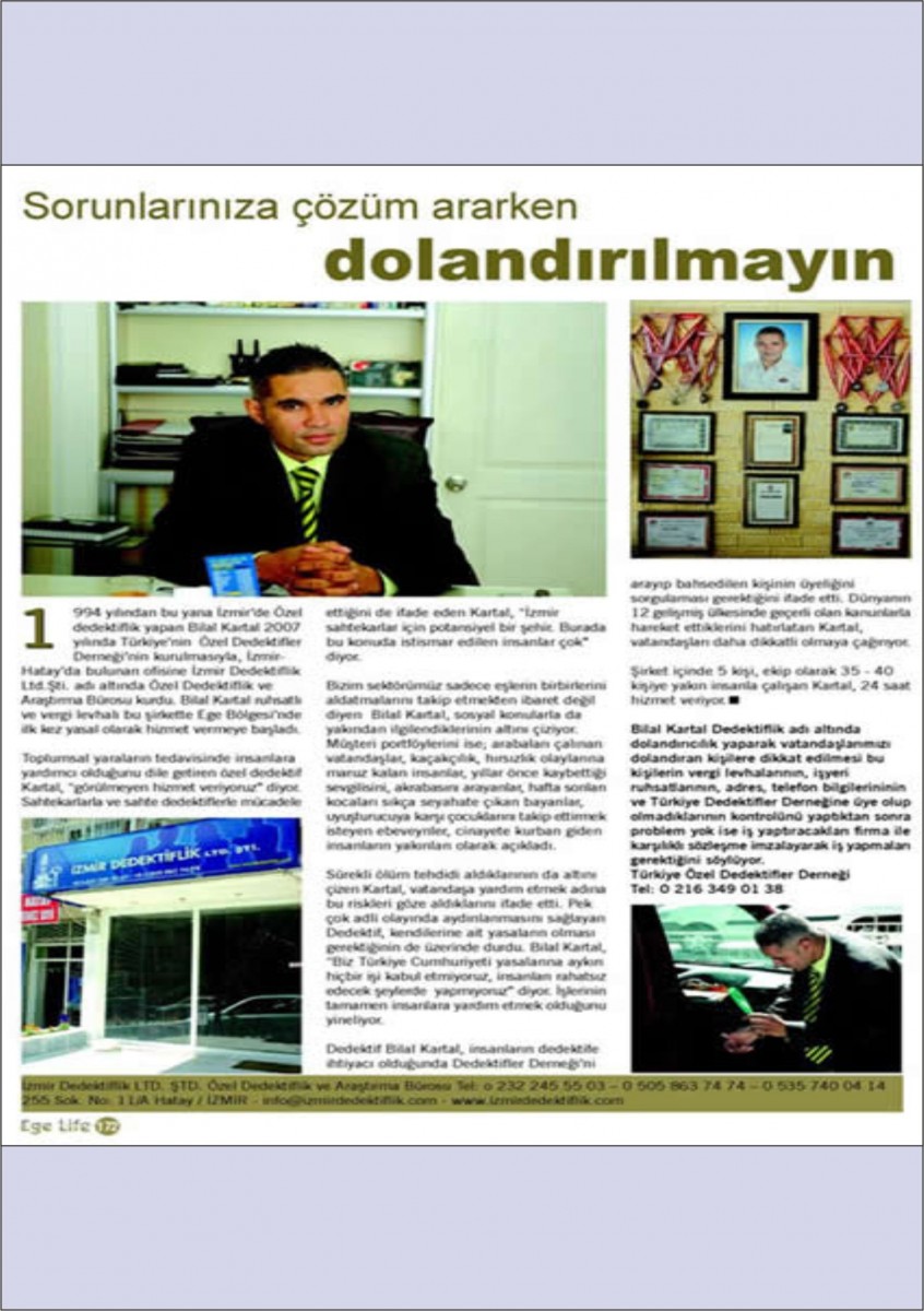 İzmir'de kurulan ilk özel dedektiflik bürosu, fuar etkinlikleriyle de basın aracılığıyla tüm çalışmalarını saygıdeğer vatandaşlarımızla paylaşıyor. Bu bakımdan siz de tüm çalışmalarımızı görmek istiyorsanız resmi web sitemizin Basında Biz alanından basında hakkımızda çıkan haber başlıkları, fuar etkinliklerimiz, genel müdürümüzün mesajı ve resmi belgelerimizi tümüyle görebilirsiniz.