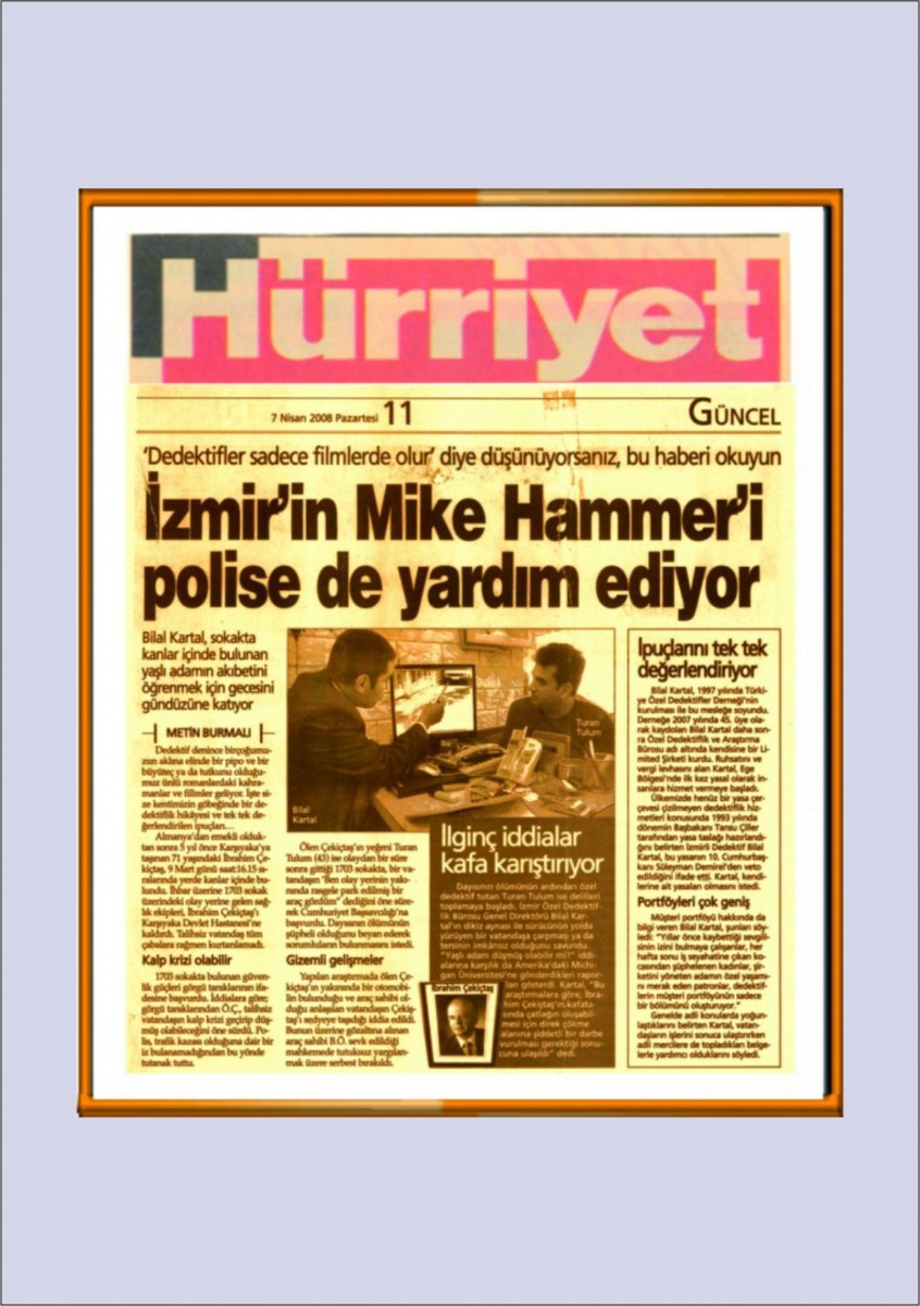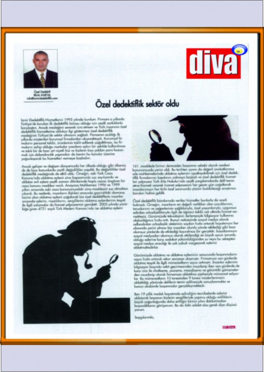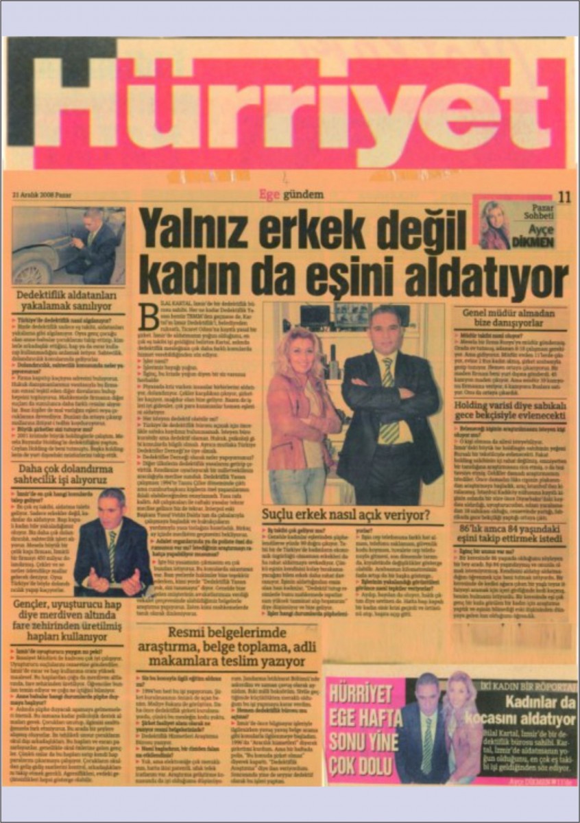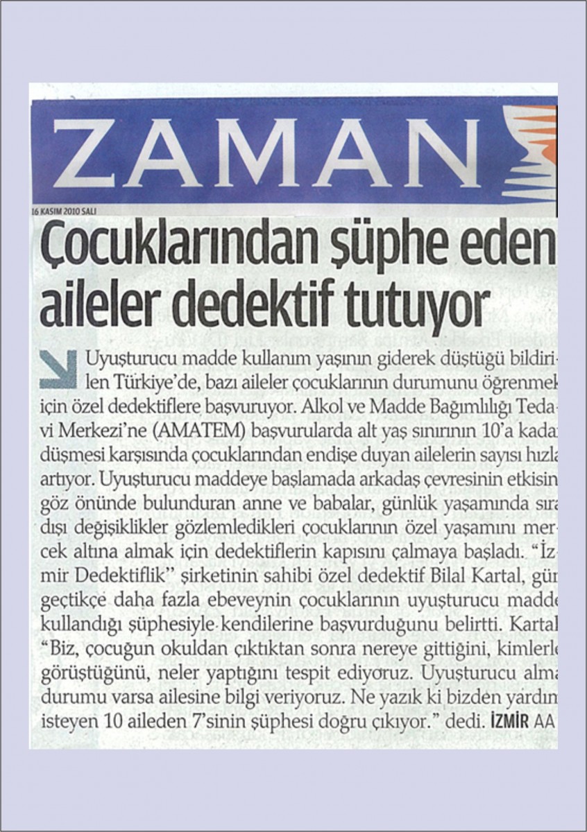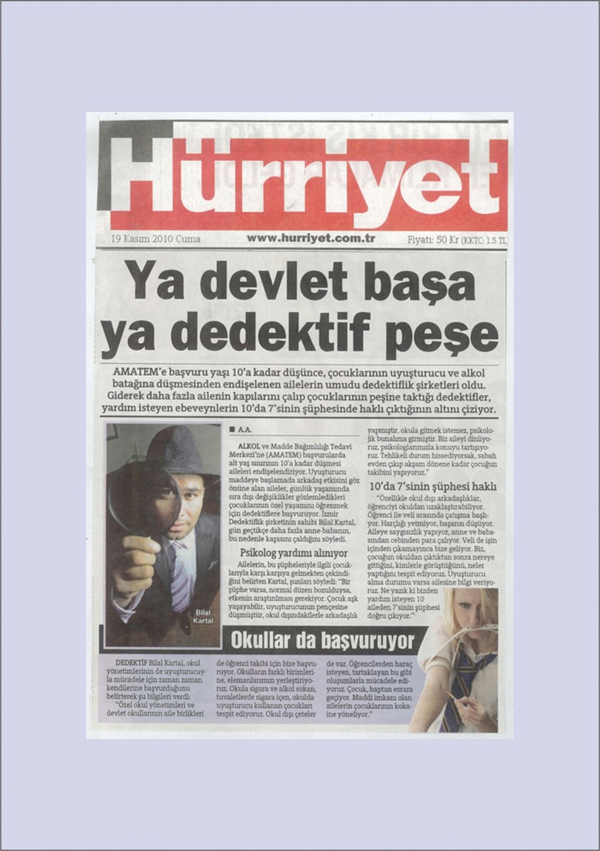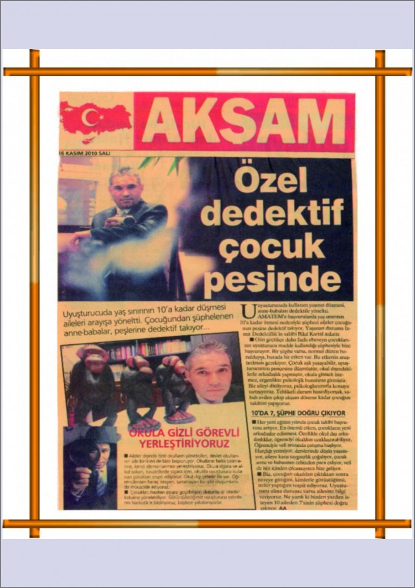 İzmir'de kurulan ilk özel dedektiflik bürosu, fuar etkinlikleriyle de basın aracılığıyla tüm çalışmalarını saygıdeğer vatandaşlarımızla paylaşıyor. Bu bakımdan siz de tüm çalışmalarımızı görmek istiyorsanız resmi web sitemizin Basında Biz alanından basında hakkımızda çıkan haber başlıkları, fuar etkinliklerimiz, genel müdürümüzün mesajı ve resmi belgelerimizi tümüyle görebilirsiniz.